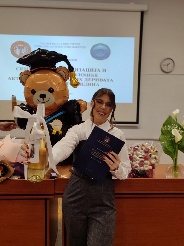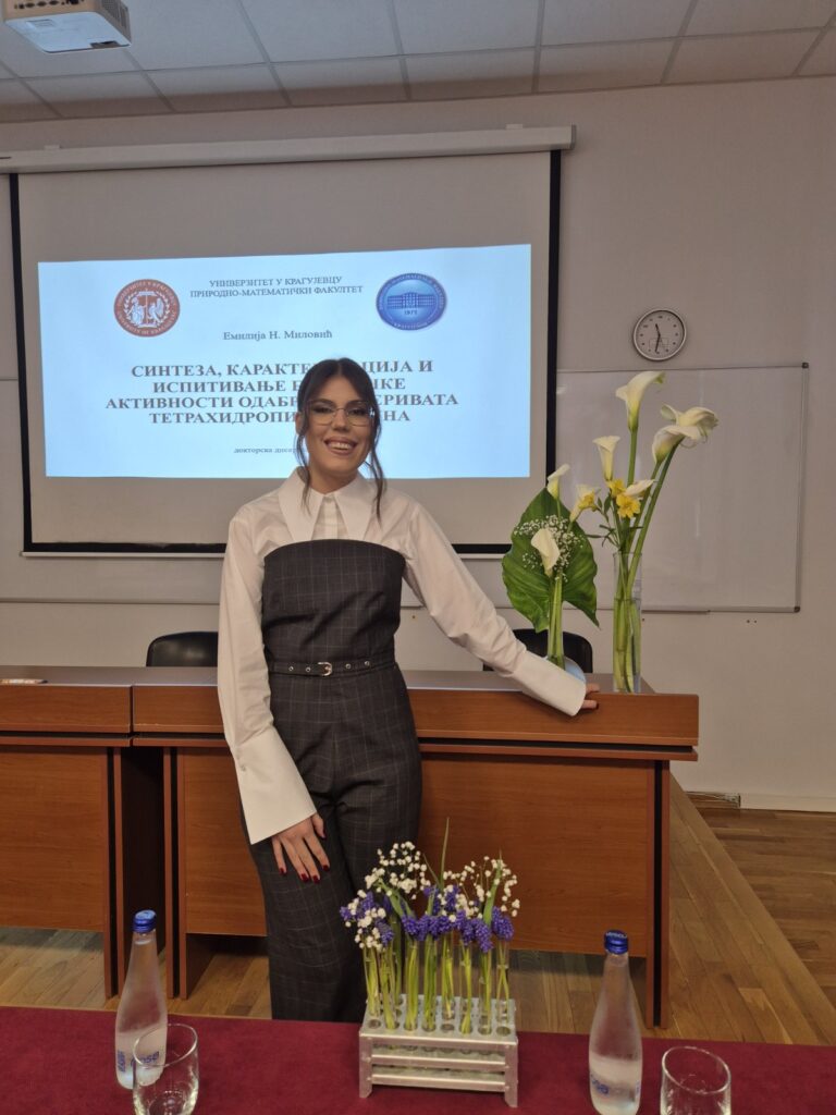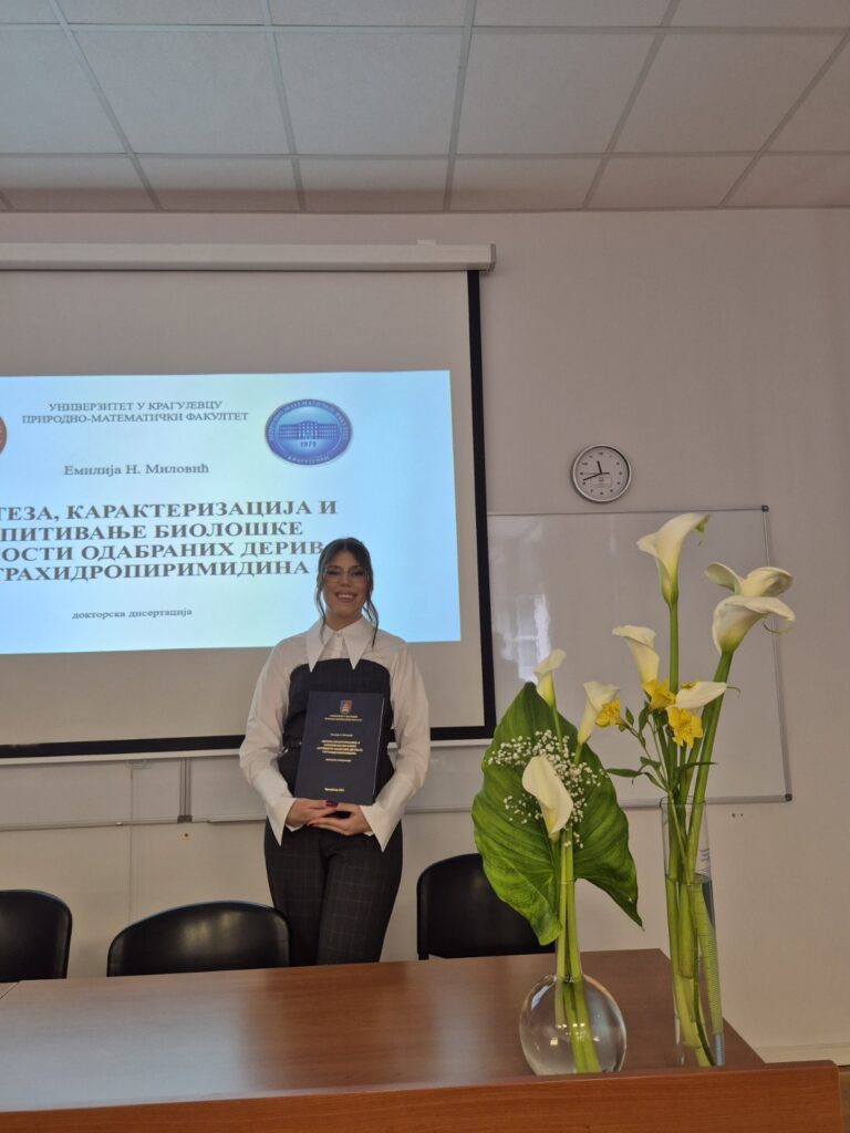 Дана 3. априла 2026. године, Емилија Миловић успешно је одбранила докторску дисертацију из области хемијских наука под називом „Синтеза, карактеризација и биолошка испитивања одабраних деривата тетрахидропиримидина“ на Природно-математичком факултету Универзитета у Крагујевцу.